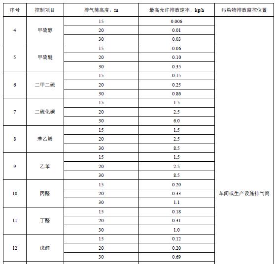 4.3 其他控制要求 4.3.1 排氣筒高度處于表1所列的兩個(gè)高度之間時(shí),惡臭污染物執(zhí)行的最高允許排放速率以?xún)?nèi)插法計(jì)算;排氣筒高度大于30m時(shí),應(yīng)按照30m相應(yīng)的排放限值執(zhí)行。內(nèi)插法見(jiàn)附錄A。 4.3.2 惡臭污染源有多根排放同一污染物的排氣筒時(shí),若其中任意相鄰兩根排氣筒距離小于其幾何高度之和,應(yīng)按附錄B的方法依次計(jì)算等效排氣筒。等效排氣筒惡臭污染物最高允許排放速率應(yīng)滿(mǎn)足表1的相應(yīng)限值。 4.3.3 惡臭污染源責(zé)任主體應(yīng)對(duì)惡臭污染物排放系統(tǒng)和污染防治設(shè)施定期維護(hù)保養(yǎng),并保存相關(guān)記錄。 5 污染物監(jiān)測(cè)要求 5.1 惡臭污染源責(zé)任主體應(yīng)按照《環(huán)境監(jiān)測(cè)管理辦法》等國(guó)家或天津市自行監(jiān)測(cè)及信息公開(kāi)相關(guān)規(guī)定和排污許可證要求,按照HJ 819對(duì)惡臭污染物排污狀況及周?chē)h(huán)境質(zhì)量的影響等情況進(jìn)行自行監(jiān)測(cè),保存原始監(jiān)測(cè)記錄信息并公布監(jiān)測(cè)結(jié)果。 5.2 惡臭污染源責(zé)任主體應(yīng)對(duì)其惡臭污染物控制設(shè)施的運(yùn)行和排放進(jìn)行有效監(jiān)控。 5.3 惡臭污染源排氣筒應(yīng)按照環(huán)境監(jiān)測(cè)管理規(guī)定和GB/T 16157的要求,設(shè)計(jì)、建設(shè)、維護(hù)永久性采樣口、采樣測(cè)試平臺(tái)和排污口標(biāo)志。 5.4 惡臭污染物監(jiān)測(cè)應(yīng)按HJ 905的要求執(zhí)行,并采用表3所列的方法標(biāo)準(zhǔn)進(jìn)行測(cè)定。本標(biāo)準(zhǔn)發(fā)布實(shí)施后,表3所列控制項(xiàng)目如有新發(fā)布的國(guó)家環(huán)境監(jiān)測(cè)分析方法標(biāo)準(zhǔn),其方法適用范圍相同的,也適用于本標(biāo)準(zhǔn)對(duì)應(yīng)控制項(xiàng)目的測(cè)定。