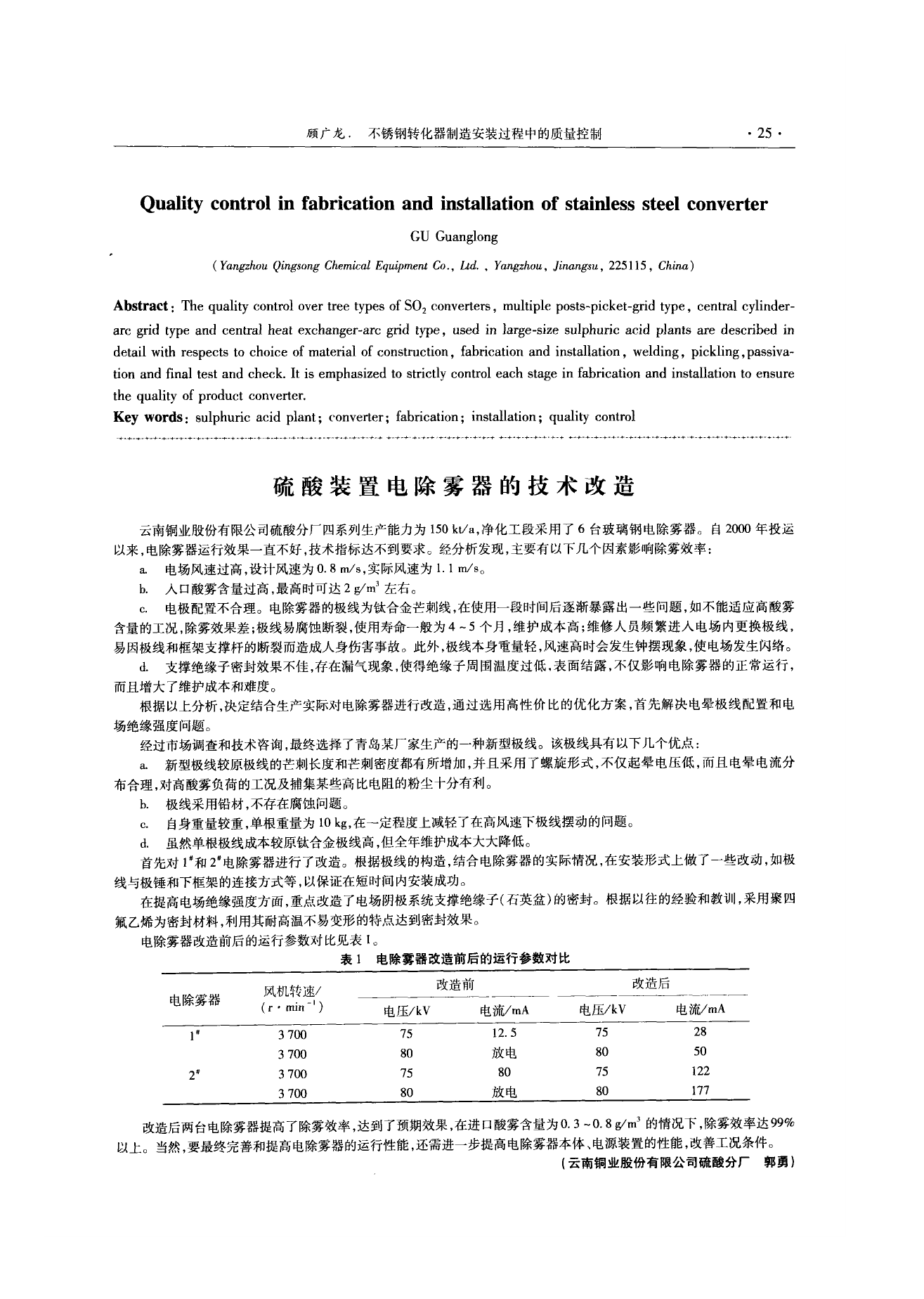 云南銅業(yè)股份有限公司硫酸分廠四系列生產(chǎn)能力為150kt/a,凈化工段采用了6臺(tái)玻璃鋼電除霧器。自2000年投運(yùn)以來(lái),電除霧器運(yùn)行效果一直不好,技術(shù)指標(biāo)達(dá)不到要求。經(jīng)分析發(fā)現(xiàn),主要有以下幾個(gè)因素影響除霧效率: