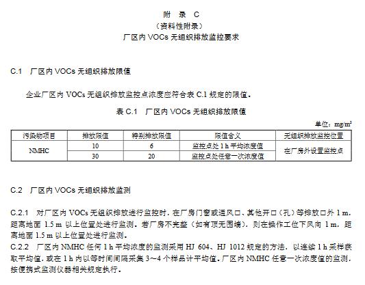 5.8 企業(yè)廠區(qū)內VOCs無組織排放監(jiān)控要求地方生態(tài)環(huán)境主管部門可根據當地環(huán)境保護需要,對廠區(qū)內VOCs無組織排放狀況進行監(jiān)控,具體實施方式由各地自行確定。廠區(qū)內VOCs無組織排放監(jiān)控要求參見附錄C。