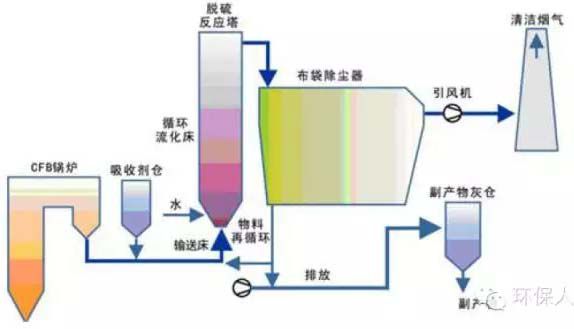 以循環(huán)流化床原理為基礎,通過物料的循環(huán)利用,在反應塔內吸收劑、吸附劑、循環(huán)灰形成濃相的床態(tài),并向反應塔中噴入水,煙氣中多種污染物在反應塔內發(fā)生化學反應或物理吸附;經(jīng)反應塔凈化后的煙氣進入下游的除塵器,進一步凈化煙氣。此時煙氣中的SO2和幾乎全部的SO3,HCl,HF等酸性成分被吸收而除去,生成CaSO3•1/2H2O、CaSO4•1/2H2O等副產(chǎn)物。